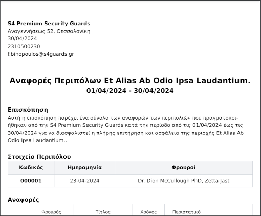 Μέσω αυτής της ενότητας ο διαχειριστής έχει την δυνατότητα να μετατρέψει σε αρχείο PDF όλες τις αναφορές των περιπόλων, ενός σημείου φύλαξης, στην χρονική περίοδο που επιλέξει.
